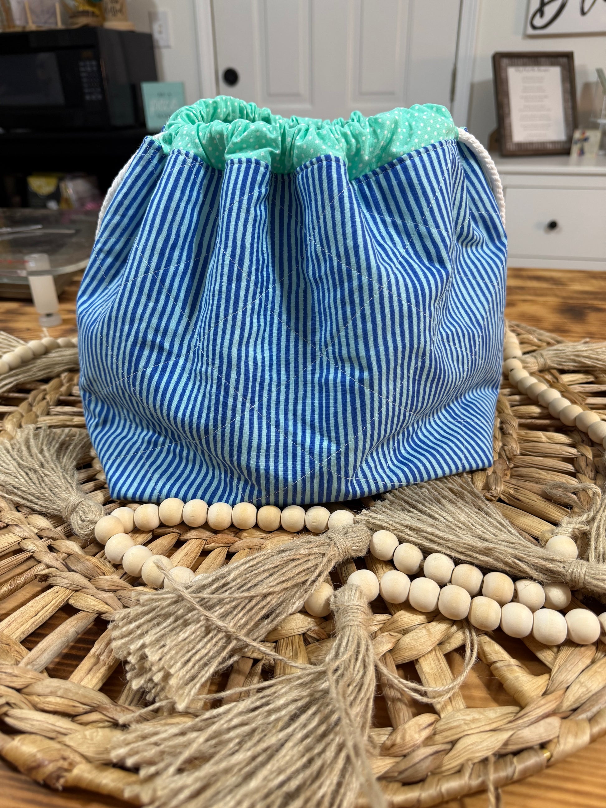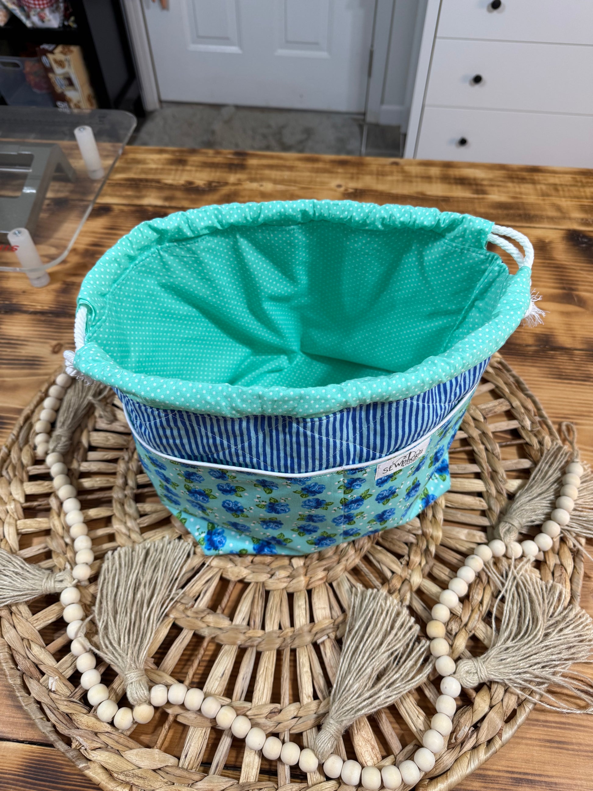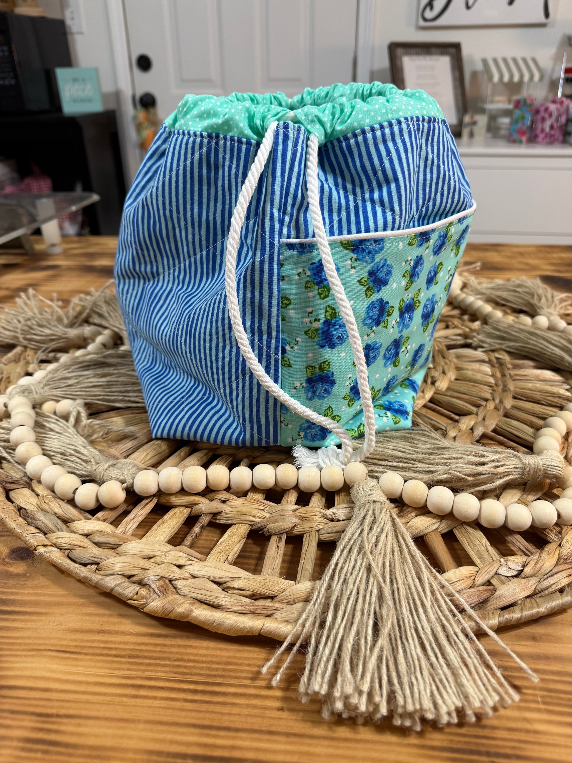 Materials: Quilting Cotton, Batting and Rope/Cord/Ribbon, Piping Trim